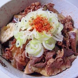 2.冷凍牛丼の具を袋の表示通りに温めて1のナスにかけ、