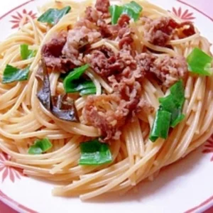2.フライパンに袋の時間通りに温めた牛丼の具を入れて火にかけ、わかめ汁の素も加えてよく溶かしたら牛乳を加え、ひと煮立ちさせ、パスタと葱を加えよく混ぜて軽く煮て出来上がり。