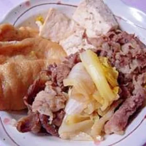 2.鍋に食べやすく切った、油揚げ・豆腐・加熱しておいた白菜・加熱しておいた牛丼の具・めんつゆを入れて煮る。