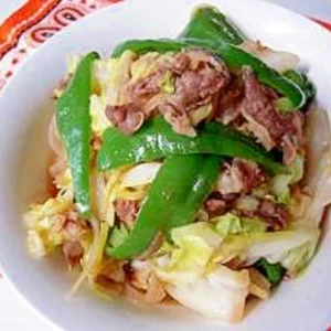 1.フライパンにスライスした玉ねぎ、食べやすく切ったキャベツ、サラダ油を入れて2~3分炒めてから縦長に切ったピーマンを加えてさらにしんなりするまで炒める。