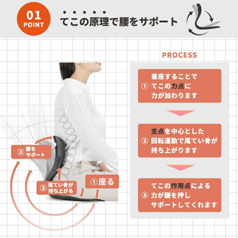 背中と腰をしっかり支えるサポートラインが内蔵されており、座るだけで骨盤が自然に立つ姿勢に導かれます。