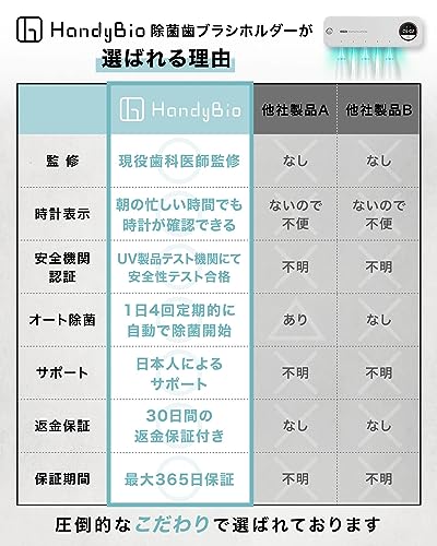 まず送風とヒーターでブラシに残った水分を飛ばし、そのうえでUV-CLEDを照射することで、「菌が増えにくい乾いた状態」へ近づけつつ除菌をねらっています。